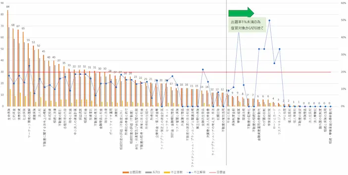 不正解率で分析したので、赤線から飛び出しているのが全て不合格ラインという見方です。