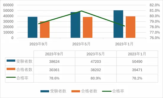 学科試験の合格率は70%台後半から80%台前半で推移しており、難易度が極端に変動することなく安定しています。