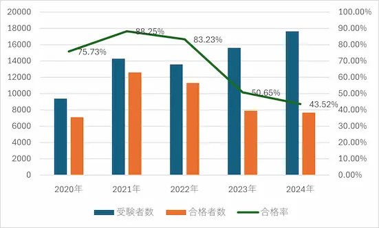 2023年度以降、40%〜53%程度、難化傾向にあり、合格率が大幅に低下しています。
