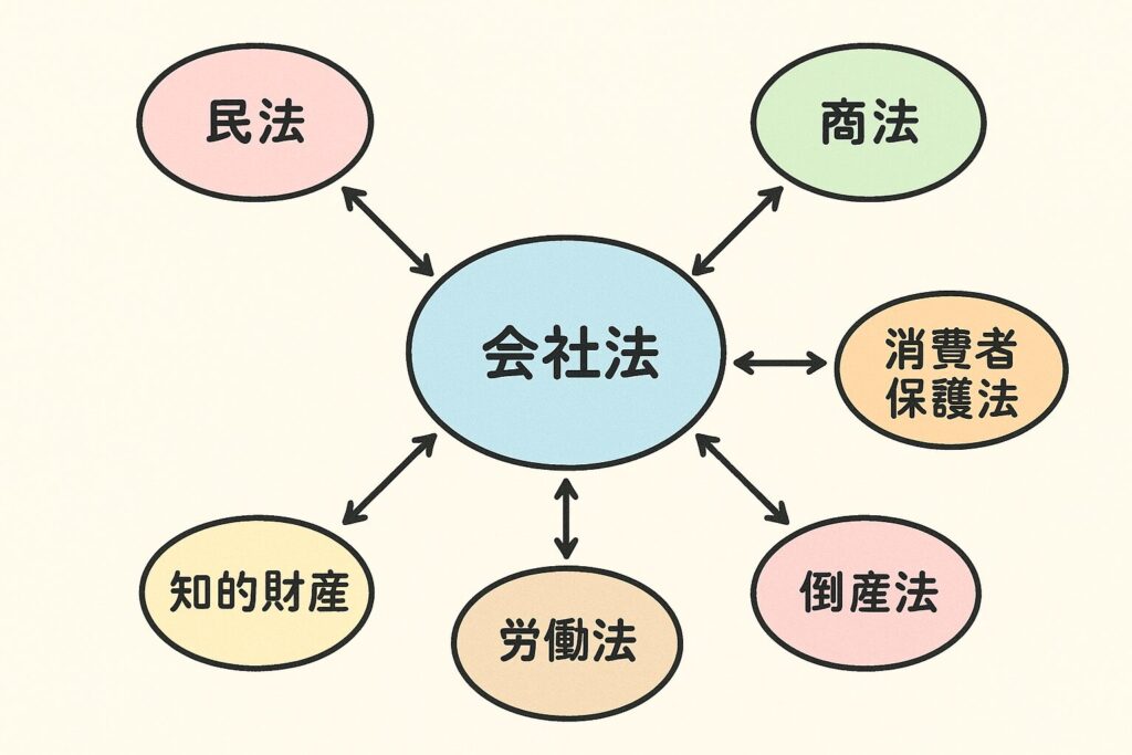 | 会社法 (Kaisha-hō) | 企業組織法 | 「会社の設立、組織、運営、資金調達、解散・清算などに関するルール」。株式会社、合同会社など4種類の会社形態を規定し、株主や債権者など利害関係者の保護も図る。 |
