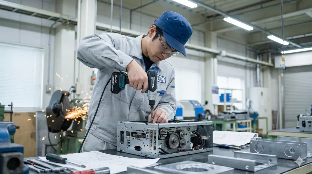 加工された部品同士を、図面に従って合体させ、製品の形にする仕事です。電動ドライバーなどの工具を使います。