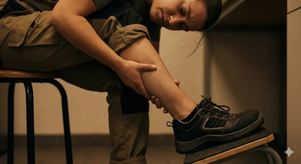 慣れるまでは、夕方になると足がパンパンになります。「着圧ソックス」は工場の女性たちの必需品です。