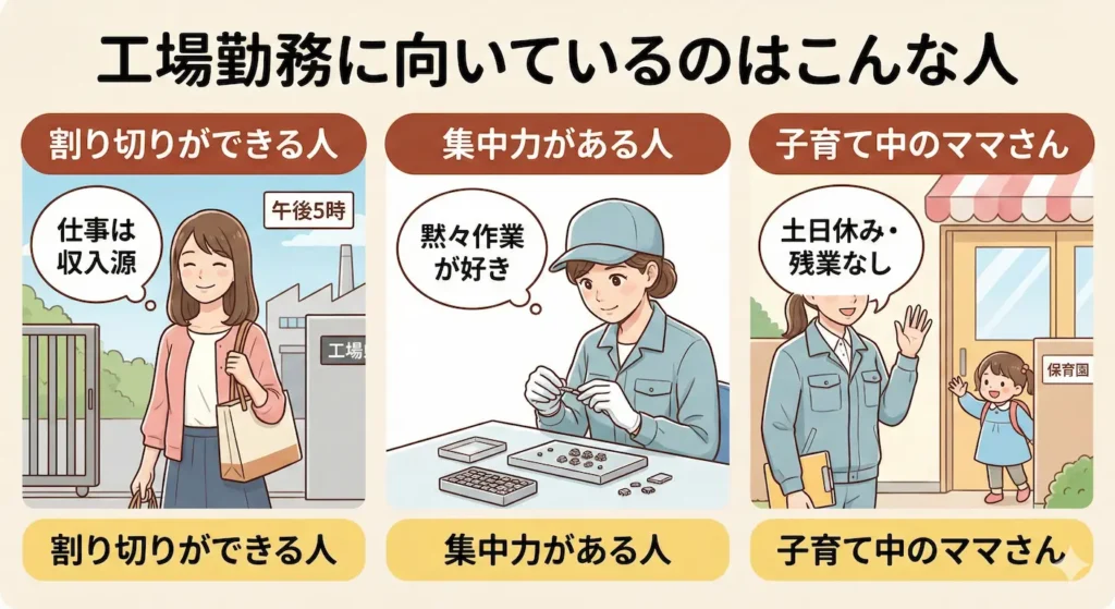 - 子育て中のママさん: 土日休みや残業なしのラインを選べば、学校行事との両立がしやすい(急な休みにも寛容な工場が多いです)。