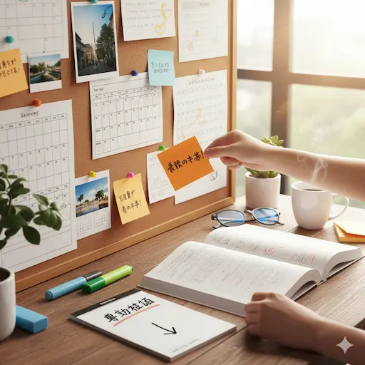 - 夜活(帰宅後): 脳が疲れている状態。暗記物の確認や、その日やったことの復習(アウトプット)に向いています。